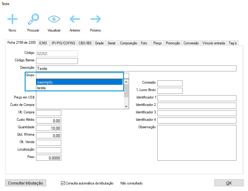 Em seguida, acesse o Controle de Estoque e associe o produto ao grupo desejado, preenchendo o campo Grupo.