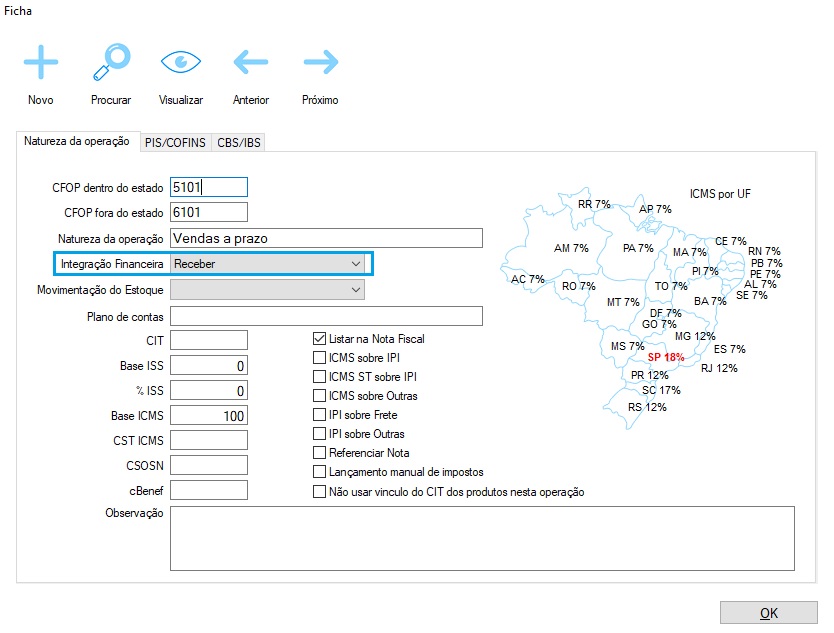 Localize o CFOP que ficará no topo da nota e, no campo Integração, informe a opção adequada: