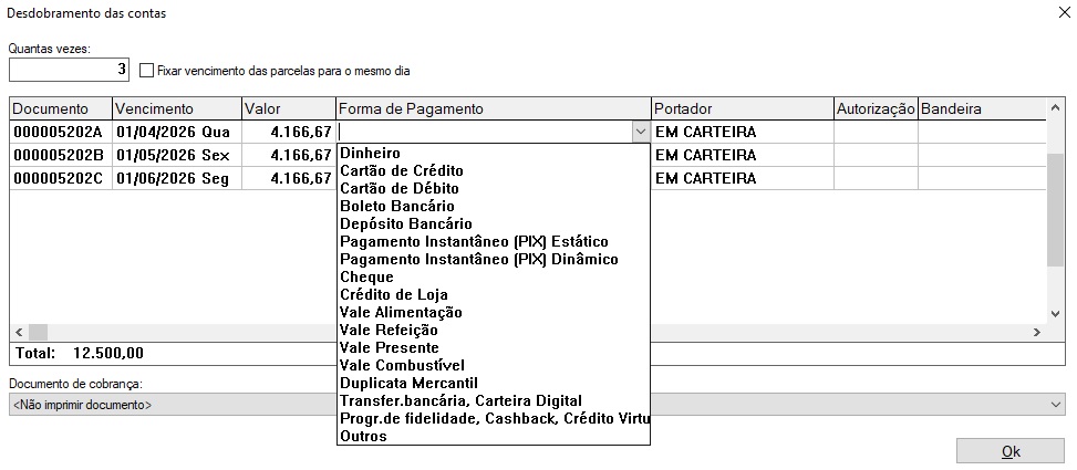 No campo Forma de Pagamento, estarão disponíveis todas as opções cadastradas no sistema.