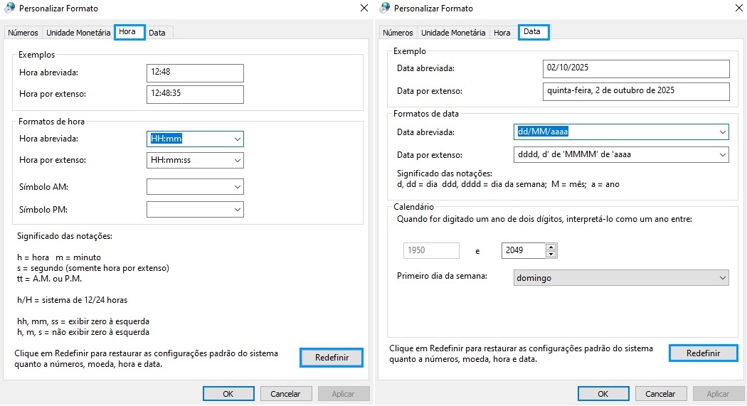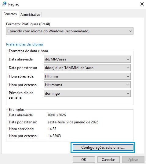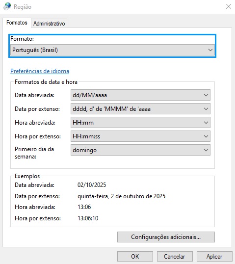 Concluídas as redefinições, clique em ok e verifique se o formato está como Português (Brasil). Caso esteja em outro formato, ajuste.