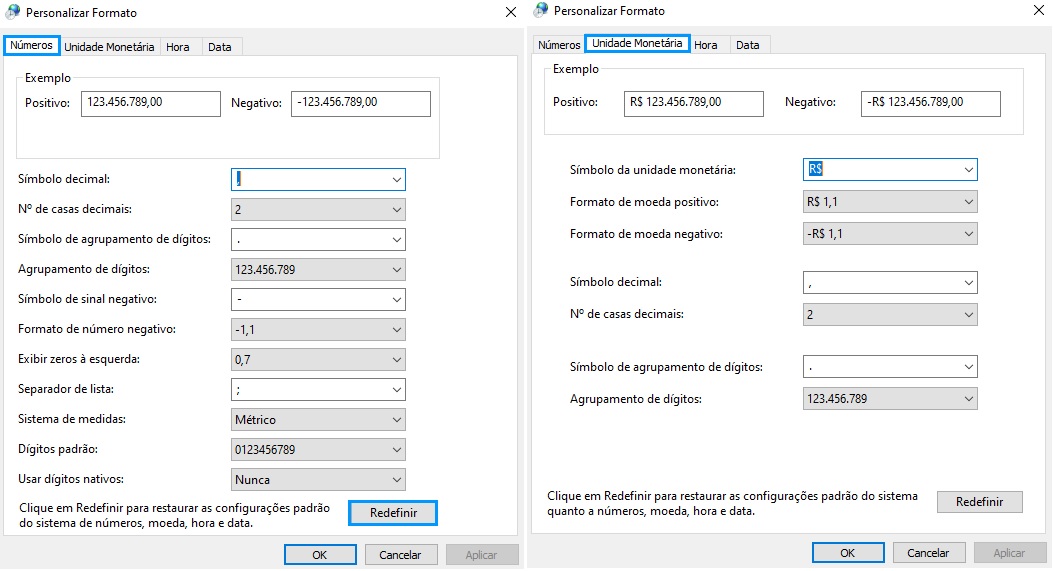 Na tela que abrir, clique na opção redefinir em todas as abas – Números, Unidade monetária, hora e data. Ao clicar em redefinir, aparecera a mensagem: Deseja remover todas as personalizações do formato atual? Clique em sim em todas as vezes que aparecer.