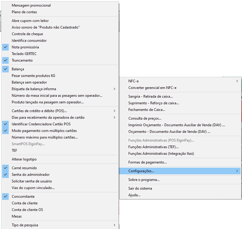 Este artigo descreve cada funcionalidade do menu do Frente de Caixa, detalhando menus e submenus para auxiliar no uso e configuração