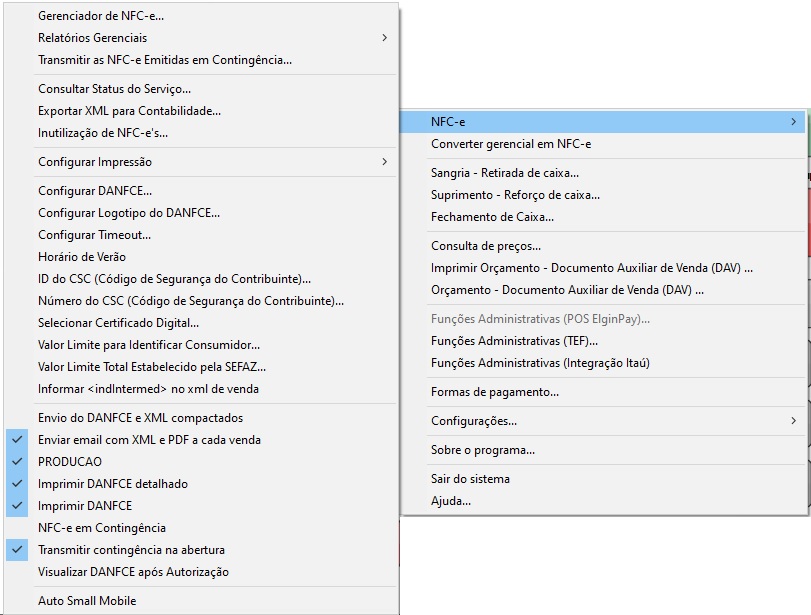 • NFC-e – Abre um submenu com diversas opções de configuração da NFC-e. Confira abaixo.
