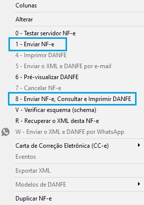 Finalize a montagem da nota com OK. Para transmissão da nota, você pode utilizar passo a passo, clicando com o botão direito opção 1 – Enviar NF-e ou ainda pela opção 8 – Enviar NF-e, Consultar e imprimir DANFE.