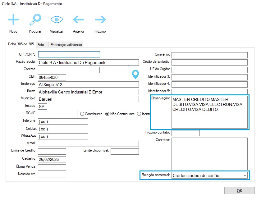 No campo Relação Comercial, selecione a opção Credenciadora de cartão