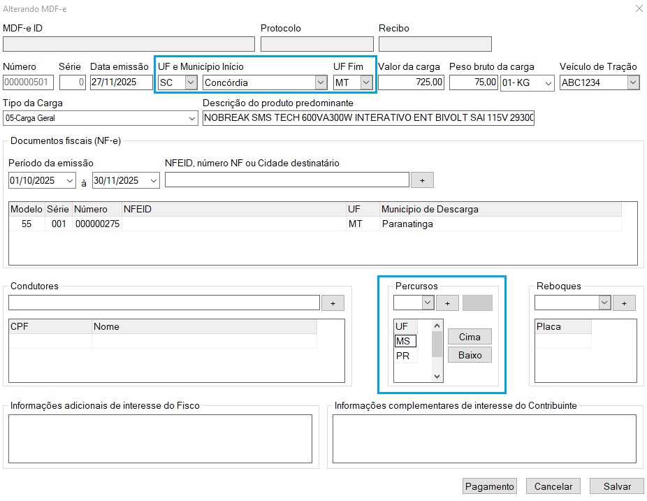No exemplo abaixo, a mercadoria sairá de SC com destino ao MT. Os estados intermediários seriam PR e MS, respectivamente. Mas a ordem informada, esta incorreta: