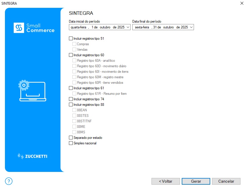 Para gerar no Small, abra o módulo estoque, clique em Arquivo > Sintegra.