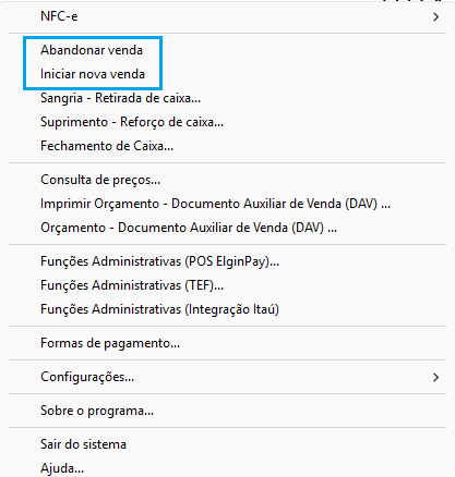 Por último volte no NFC-e e abandone a venda aberta. Se precisar, você também pode “estacionar” a NFC-e aberta enquanto emite a NF-e, pressionando F10 > Iniciar nova venda.